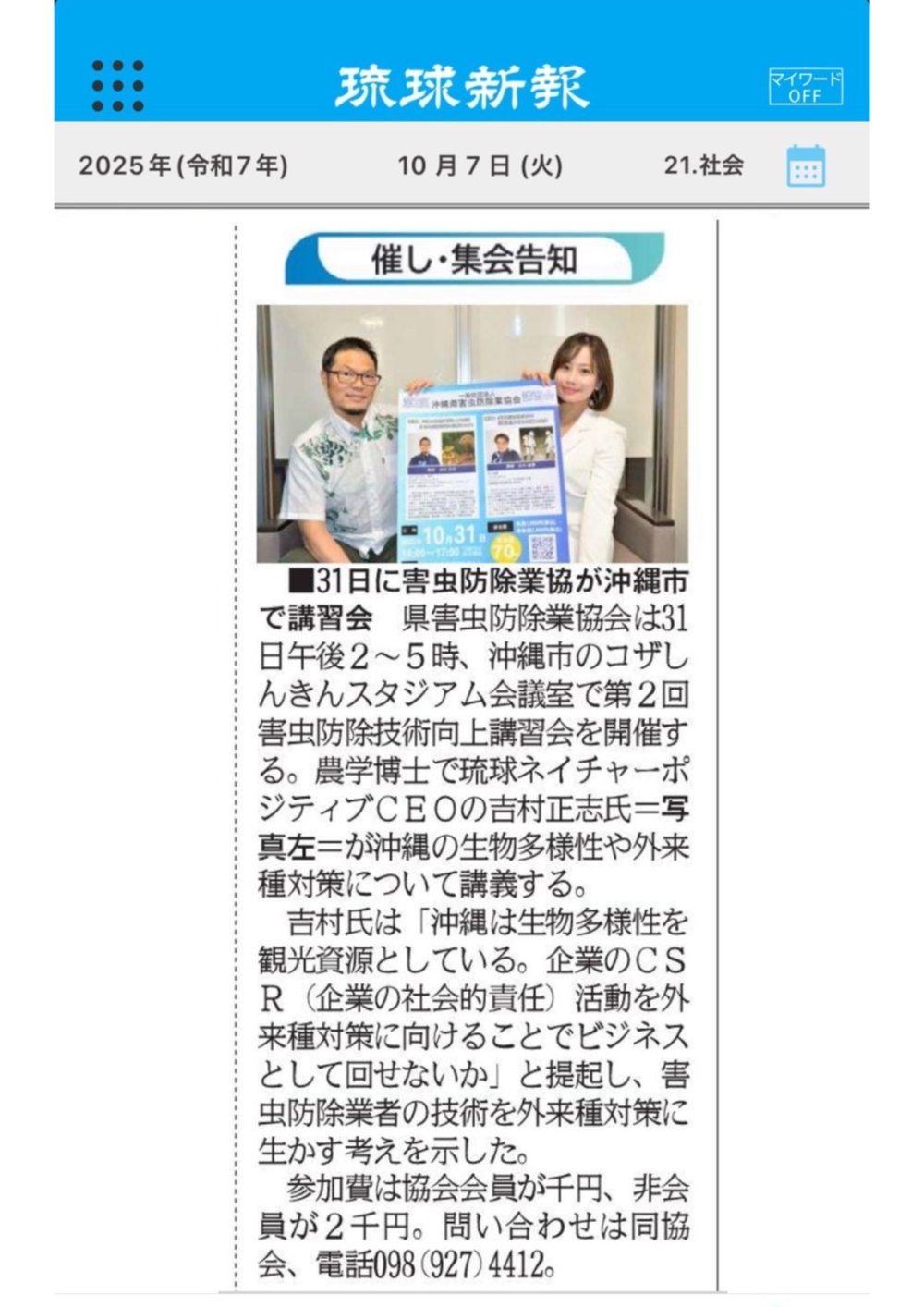 当協会が主催する「第2回 沖縄県害虫防除技術向上講習会」に関する記事が掲載されました。
