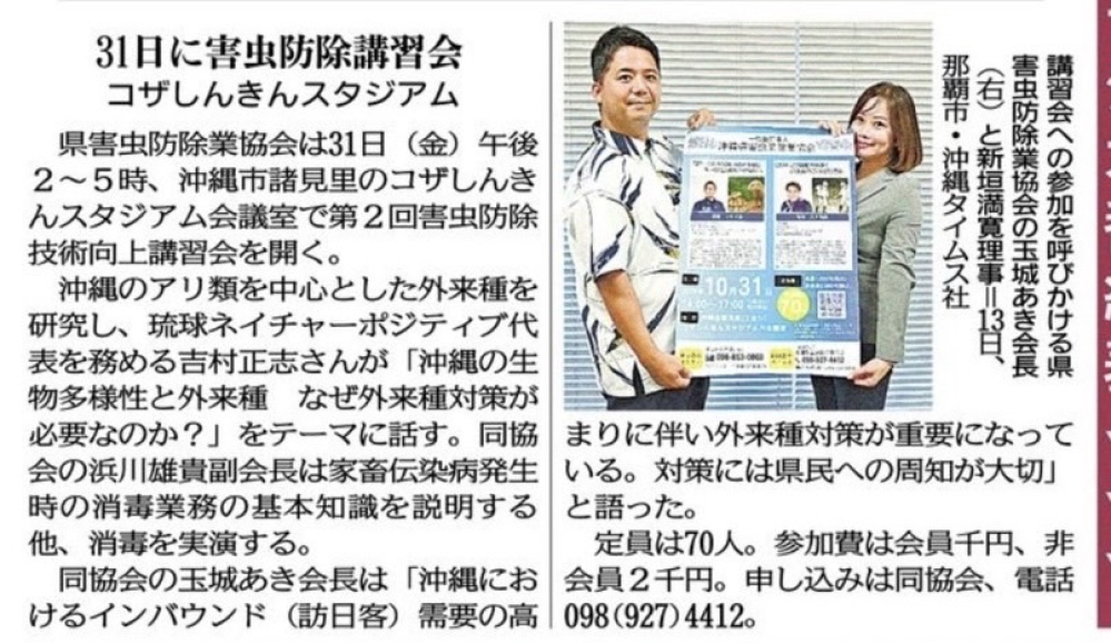 【メディア掲載】第2回 沖縄県害虫防除技術向上講習会が新聞に掲載されました